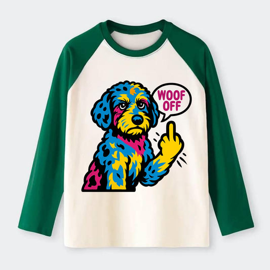 Aussiedoodle with merle patches and curly coat, playful smart paw - Raglan Long Sleeve T-Shirt