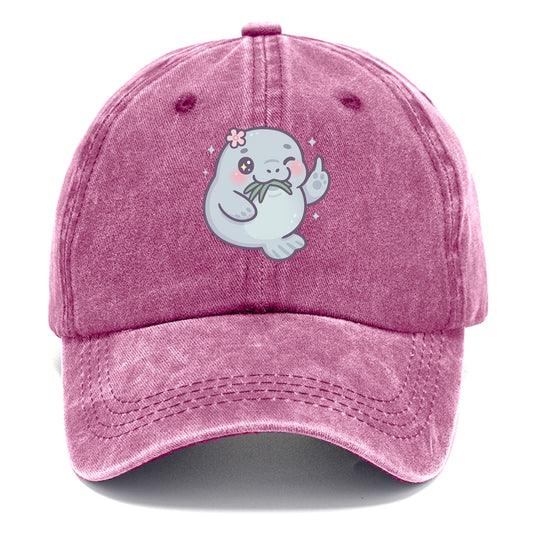 chubby manatee munching on seagrass, one flipper raised with sass - Baseball Cap