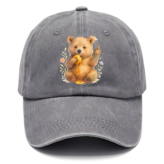 chubby bear cub eating dripping honey, sticky paw up with middle finger - Baseball Cap