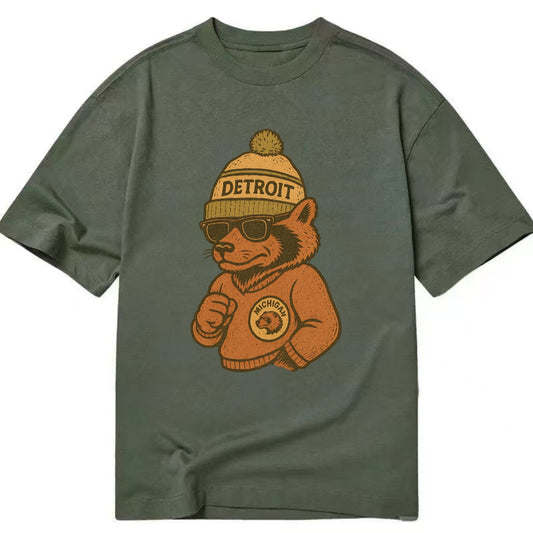 Michigan Wolverine wearing Detroit beanie with pom pom and wayfarer sunglasses - Vintage T-shirt