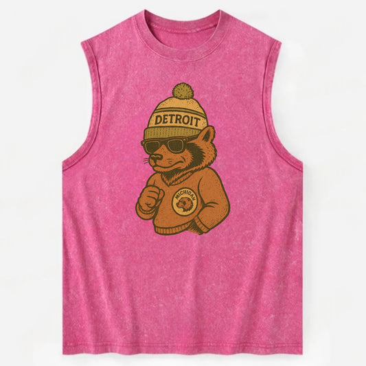 Michigan Wolverine wearing Detroit beanie with pom pom and wayfarer sunglasses - Vintage Washed Tank