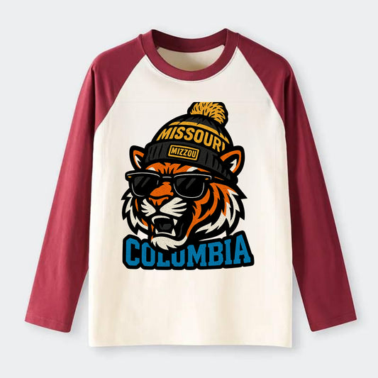 Columbia Tiger wearing Missouri beanie with Mizzou patch - Contrast Raglan T-shirt