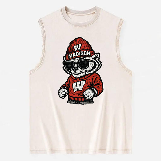 Madison Badger wearing Wisconsin beanie with motion W patch - Vintage Washed Tank