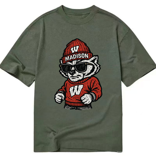 Madison Badger wearing Wisconsin beanie with motion W patch - Classic T-shirt
