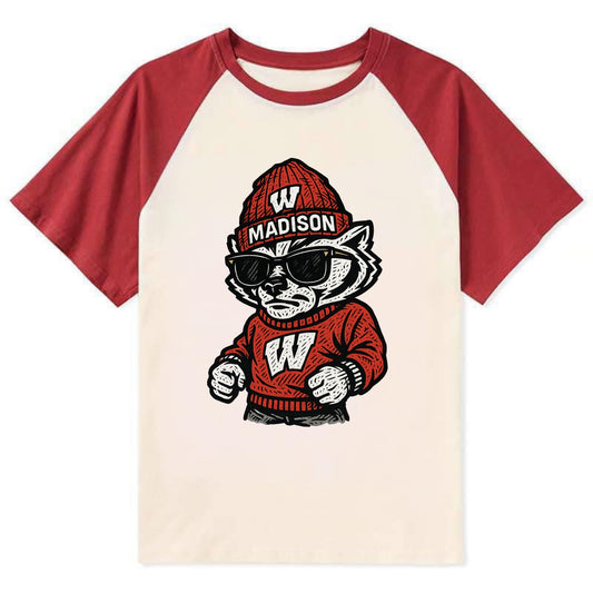 Madison Badger wearing Wisconsin beanie with motion W patch - Contrast Raglan T-shirt
