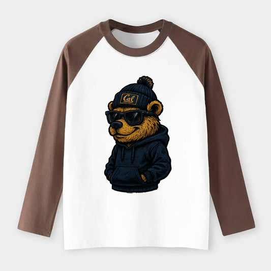 Berkeley Bear wearing Cal beanie with script patch - Contrast Raglan T-shirt