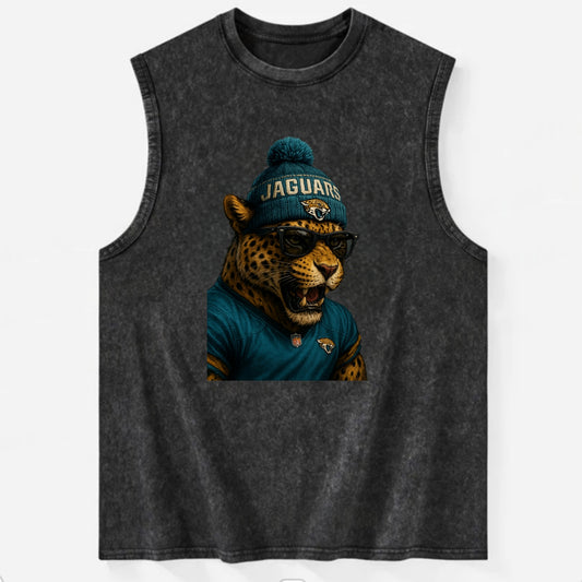 Jacksonville Jaguar wearing Jaguars teal and gold beanie with pom pom and - Vintage Washed Tank
