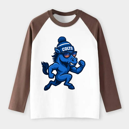 Indianapolis Colt Horse wearing Colts blue and white beanie with pom pom - Contrast Raglan T-shirt