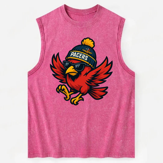 Indiana Cardinal wearing Pacers beanie with speedway patch and wayfarer - Vintage Washed Tank