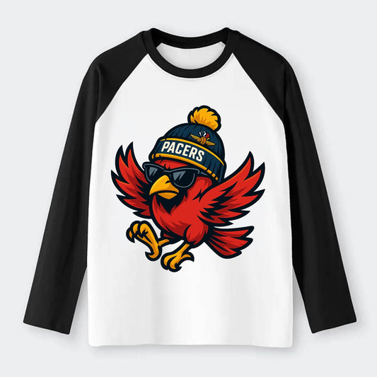 Indiana Cardinal wearing Pacers beanie with speedway patch and wayfarer - Contrast Raglan T-shirt