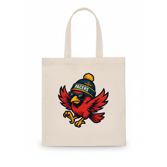 Indiana Cardinal wearing Pacers beanie with speedway patch and wayfarer sunglasses - Tote Bag