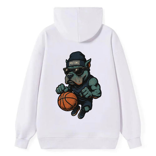 Detroit Pitbull wearing Pistons beanie with chrome patch and wayfarer - Classic Pullover Hoodie