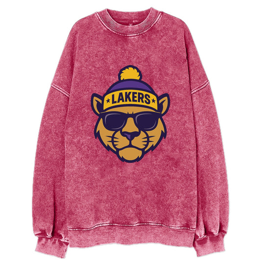 LA Mountain Lion wearing Lakers purple and gold beanie with championship stars - Vintage Sweatshirt