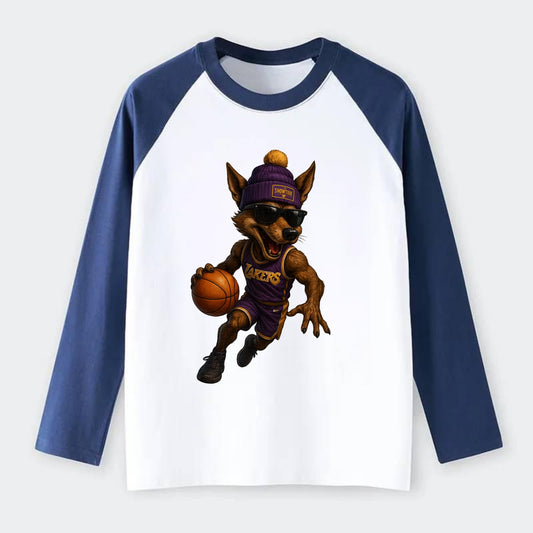 Hollywood Coyote wearing Lakers beanie with Showtime patch and - Raglan Long Sleeve T-Shirt