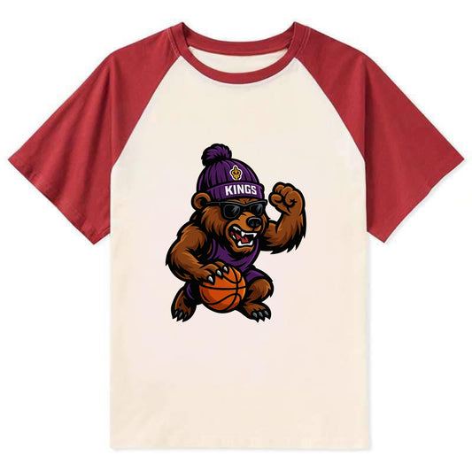 California Grizzly wearing Kings beanie with royal scepter patch and - Contrast Raglan T-shirt