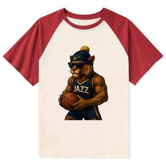 Utah Mountain Lion wearing Jazz navy and yellow beanie with music note - Contrast Raglan T-shirt