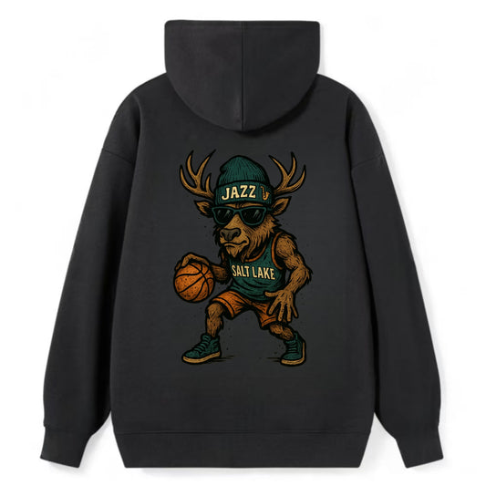 Salt Lake Elk wearing Jazz beanie with saxophone patch and wayfarer - Classic Pullover Hoodie
