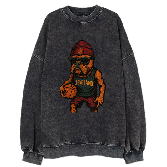 Cleveland Bulldog wearing Cavaliers wine and gold beanie with sword patch and - Vintage Sweatshirt