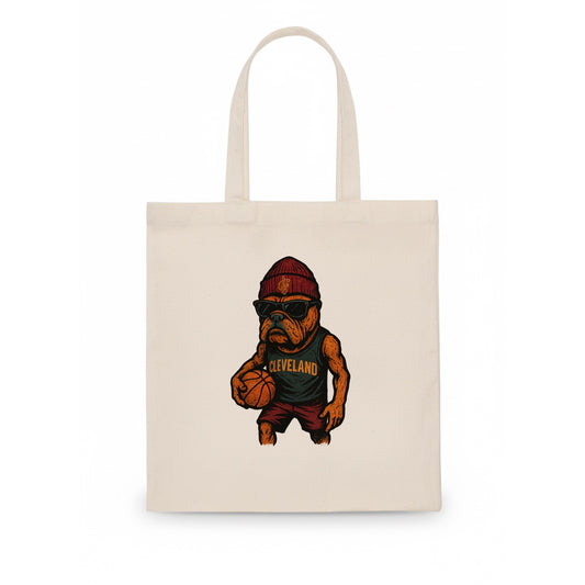 Cleveland Bulldog wearing Cavaliers wine and gold beanie with sword patch and wayfarer - Tote Bag