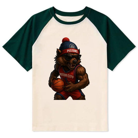Motor City Wolverine wearing Pistons beanie with gear patch and wayfarer - Contrast Raglan T-shirt