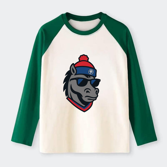Detroit Stallion wearing Pistons red and blue beanie with piston patch - Raglan Long Sleeve T-Shirt