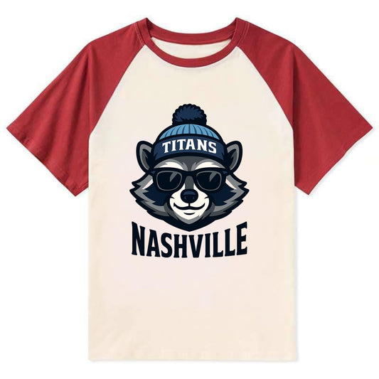 Nashville Raccoon wearing Titans navy and light blue beanie with pom pom - Contrast Raglan T-shirt