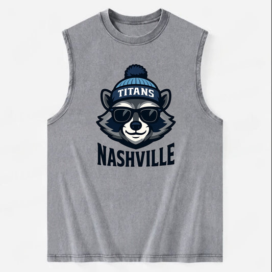 Nashville Raccoon wearing Titans navy and light blue beanie with pom pom and - Vintage Washed Tank