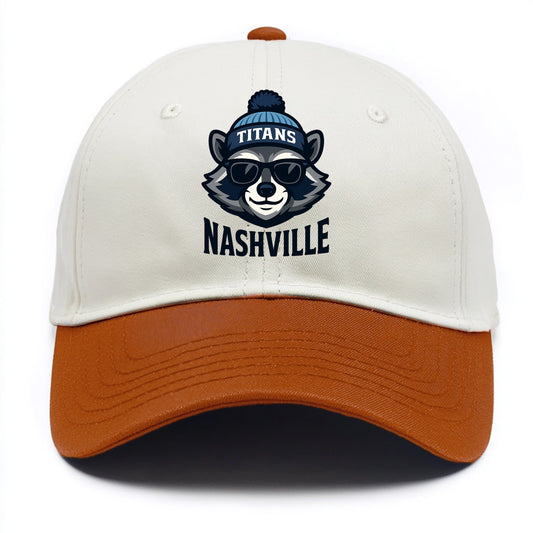 Nashville Raccoon wearing Titans navy and light blue beanie with pom pom and wayfarer - Classic Cap