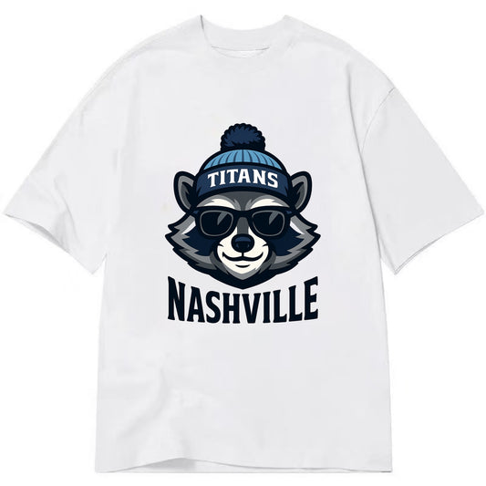 Nashville Raccoon wearing Titans navy and light blue beanie with pom pom and - Vintage T-shirt