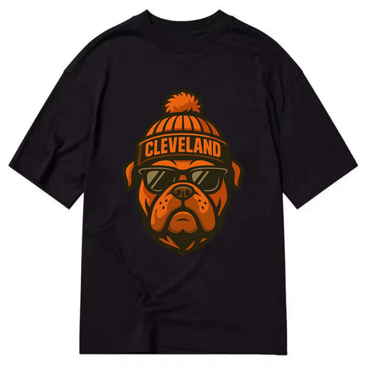 Cleveland Bulldog wearing Browns orange and brown beanie with pom pom and - Vintage T-shirt