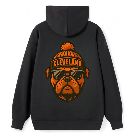 Cleveland Bulldog wearing Browns orange and brown beanie with pom pom and - Classic Pullover Hoodie
