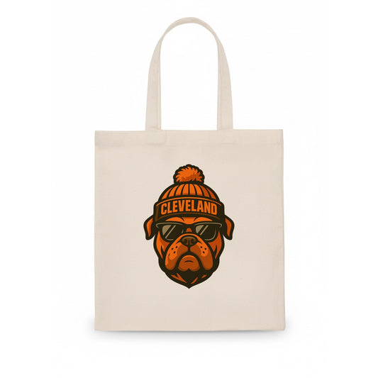 Cleveland Bulldog wearing Browns orange and brown beanie with pom pom and wayfarer - Tote Bag