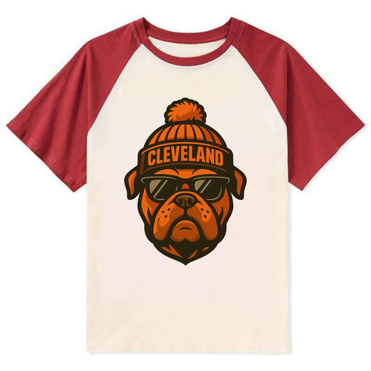 Cleveland Bulldog wearing Browns orange and brown beanie with pom pom and - Contrast Raglan T-shirt