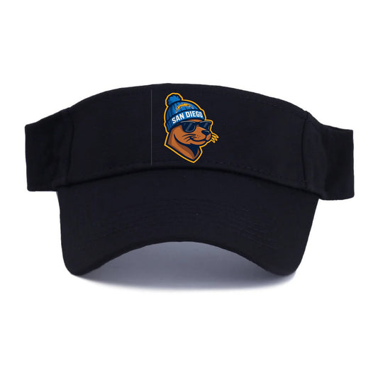 San Diego Sea Lion wearing Chargers beanie with bolt patch and wayfarer sunglasses - Visor