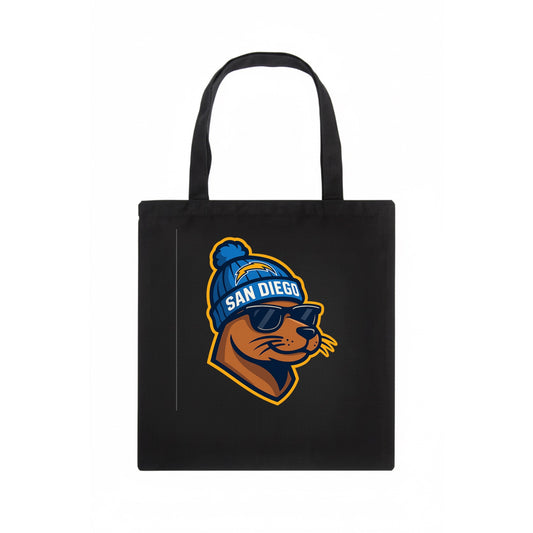 San Diego Sea Lion wearing Chargers beanie with bolt patch and wayfarer sunglasses - Tote Bag