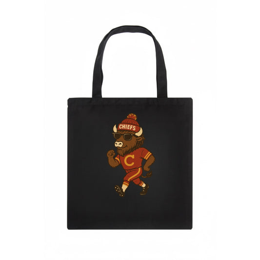 KC Bison wearing Chiefs beanie with arrowhead patch and wayfarer sunglasses - Tote Bag