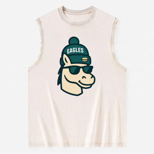 Philadelphia Horse wearing Eagles beanie with cheesesteak patch and wayfarer - Vintage Washed Tank