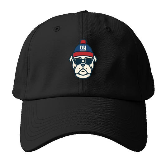 New York Bulldog wearing Giants blue and red beanie with pom pom and wayfarer - Baseball Cap