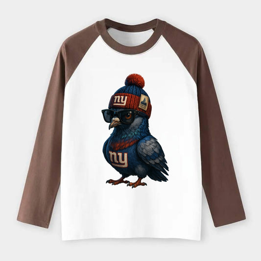 Manhattan Pigeon wearing Giants beanie with Empire State patch and - Contrast Raglan T-shirt