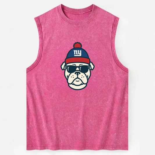 New York Bulldog wearing Giants blue and red beanie with pom pom and wayfarer - Vintage Washed Tank