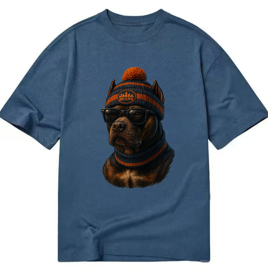 Chicago Pitbull wearing Bears beanie with skyline patch and wayfarer sunglasses - Classic T-shirt