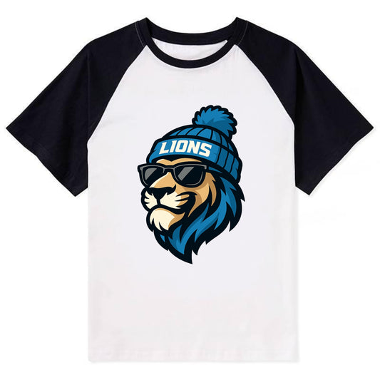 Detroit Lion wearing Lions Honolulu blue and silver beanie with pom pom - Contrast Raglan T-shirt