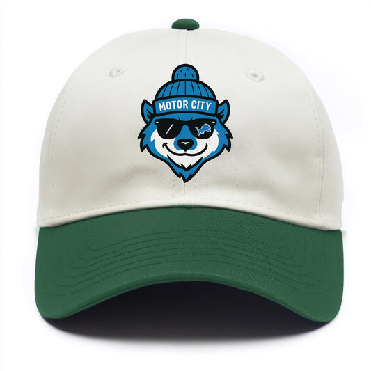 Motor City Wolverine wearing Lions beanie with gear patch and wayfarer sunglasses - Baseball Cap