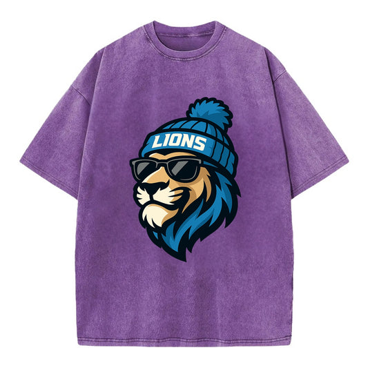 Detroit Lion wearing Lions Honolulu blue and silver beanie with pom pom and - Vintage T-shirt