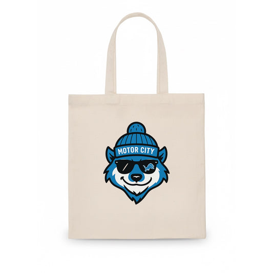 Motor City Wolverine wearing Lions beanie with gear patch and wayfarer sunglasses - Tote Bag