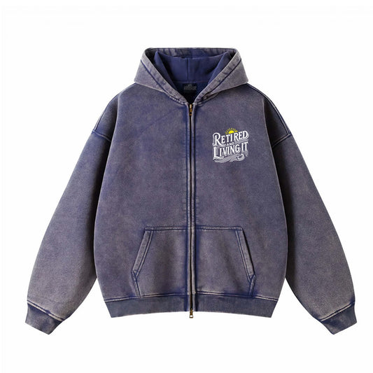 Sudadera con capucha y cremallera de algodón vintage "Jubilado y viviendo"