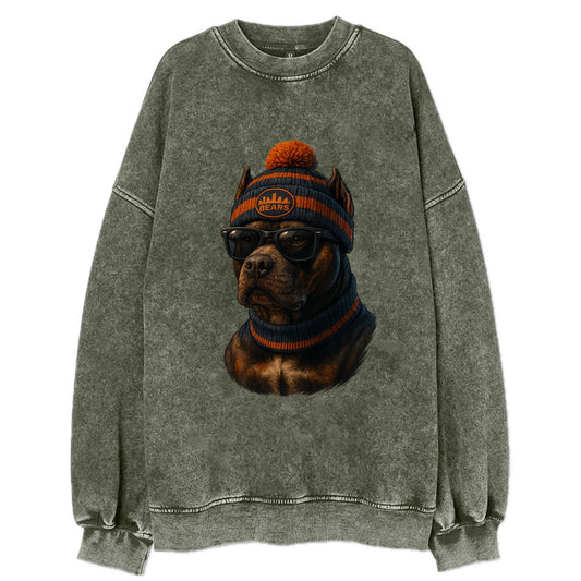 Chicago Pitbull wearing Bears beanie with skyline patch and wayfarer sunglasses - Vintage Sweatshirt