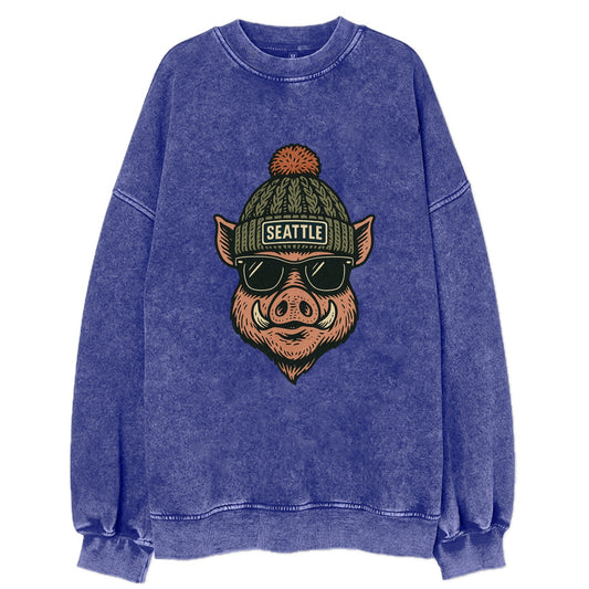 Washington Hog wearing Seattle beanie with pom pom and wayfarer sunglasses - Vintage Sweatshirt
