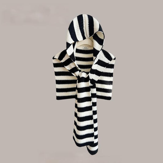 Women's Striped Knitted Hooded Shawl, Autumn Winter Warm Neck-Protective Scarf