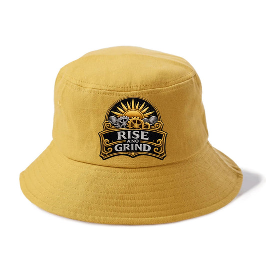 RISE AND GRIND - sun with gears in gold , morning motivation - Bucket Hat